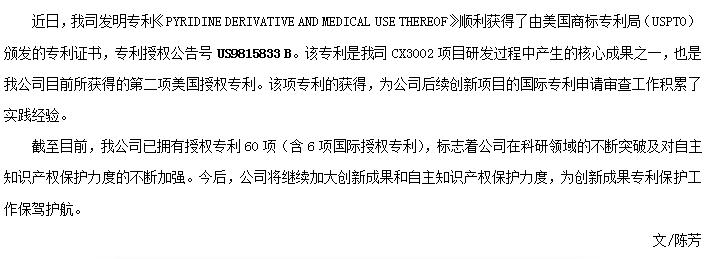 热烈祝贺我公司CX3002项目技术获得美国发明专利