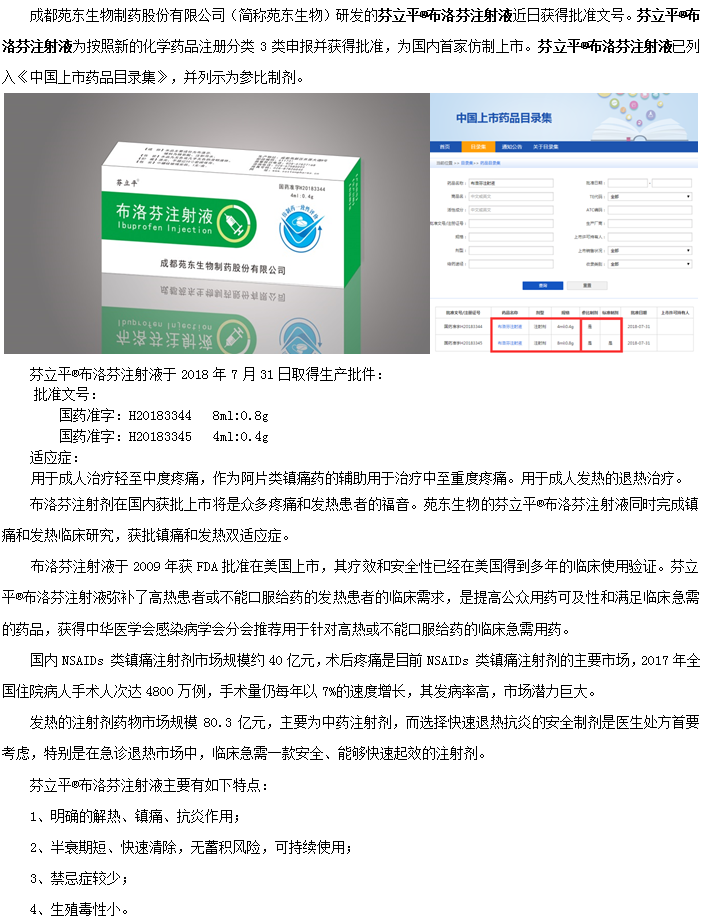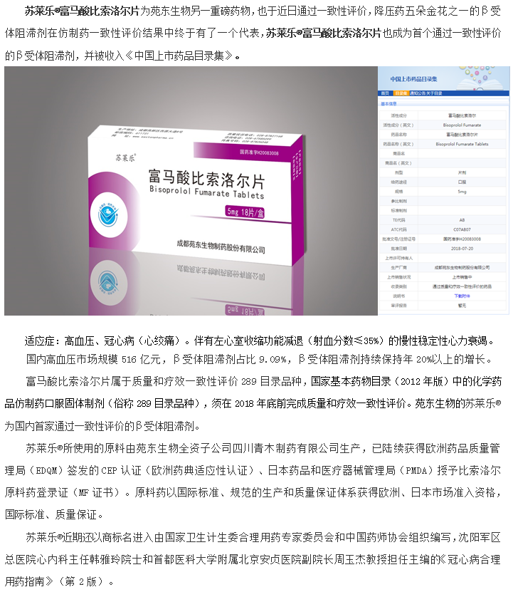苑东生物两重磅药物被收入《中国上市药品目录集》